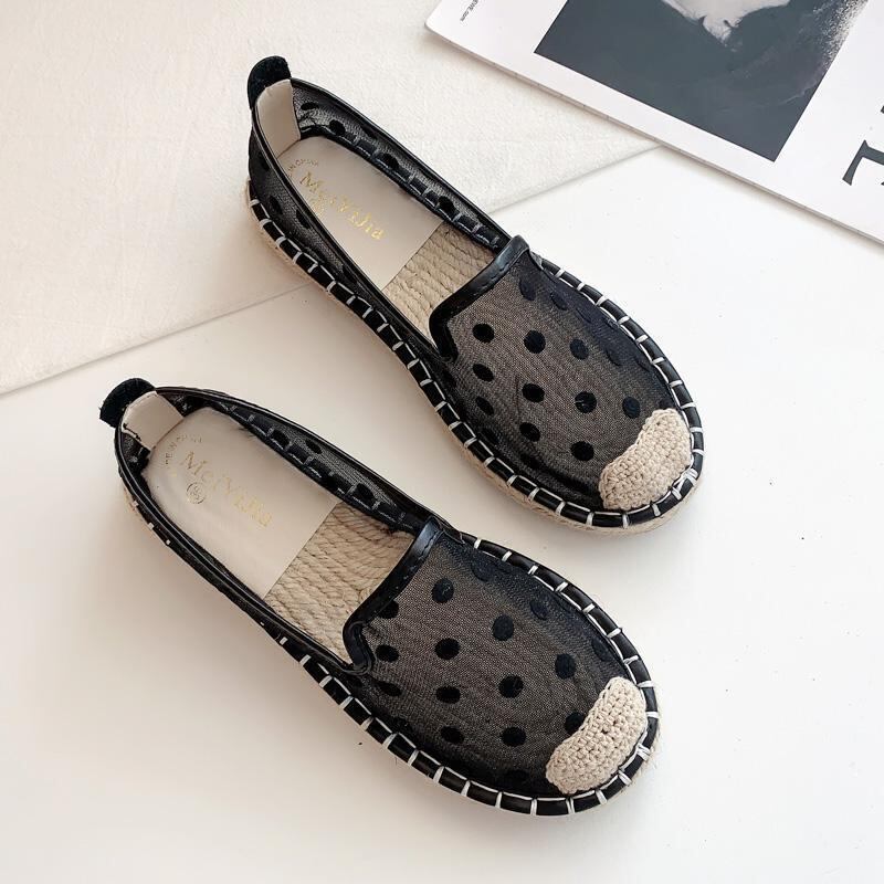 シアードットがフェミニンなエスパドリーユです。シアードットとジュートのミックスがエレガントなデザインです。フラットシューズで歩きやすさも◎。夏のムードにぴったりの、スタイリングしやすいエスパドリーユです。
