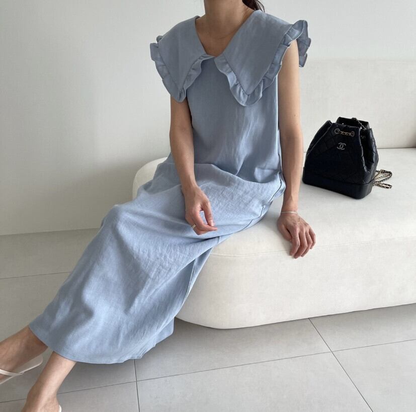 フリルのついたワイドカラーがポイントのフェミニンなロング丈のワンピースです。ストレートなシルエットでスタイルアップも叶います。暑い日も1枚でさらっと着こなせ、スニーカーやキャップなどとカジュアルなコーデも楽しめます。それぞれの雰囲気が楽しめる4色展開、涼しげなライトブルーです。
