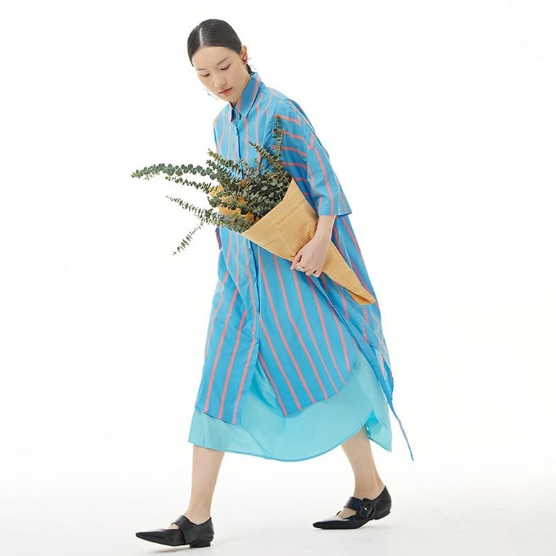 ストライプを縦横に切り替えたユニークなシャツワンピースです。ターコイズとオレンジのユニークなストライプがハイセンス。オーバーサイズでゆったりめな作りになっています。ウエストのストリングは結んでも、そのまま垂らしても、コーデのアクセントとしてスタイリングが楽しめます。シアースカートはワンピースのペチコートとしても、7枚目の画像のようにレイヤードしてスタイリングするのもオススメです。