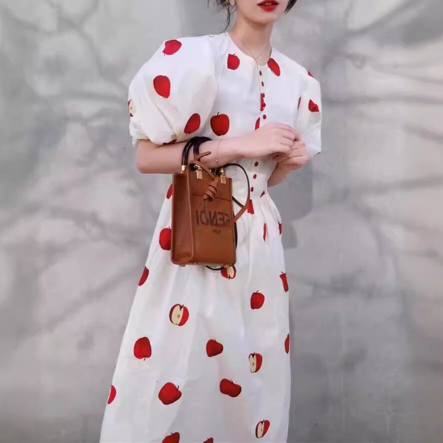 アップルプリントがキュートなワンピースです。全体的にタイトめのシルエットで、パフスリーブや胸元のボタン、フレアのシルエットなどクラシカルで上品なデザインです。ホワイトとレッドのヴィヴィッドなコントラストが魅力的、夏のお出かけにぴったりのフェミニンなデザインです。