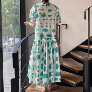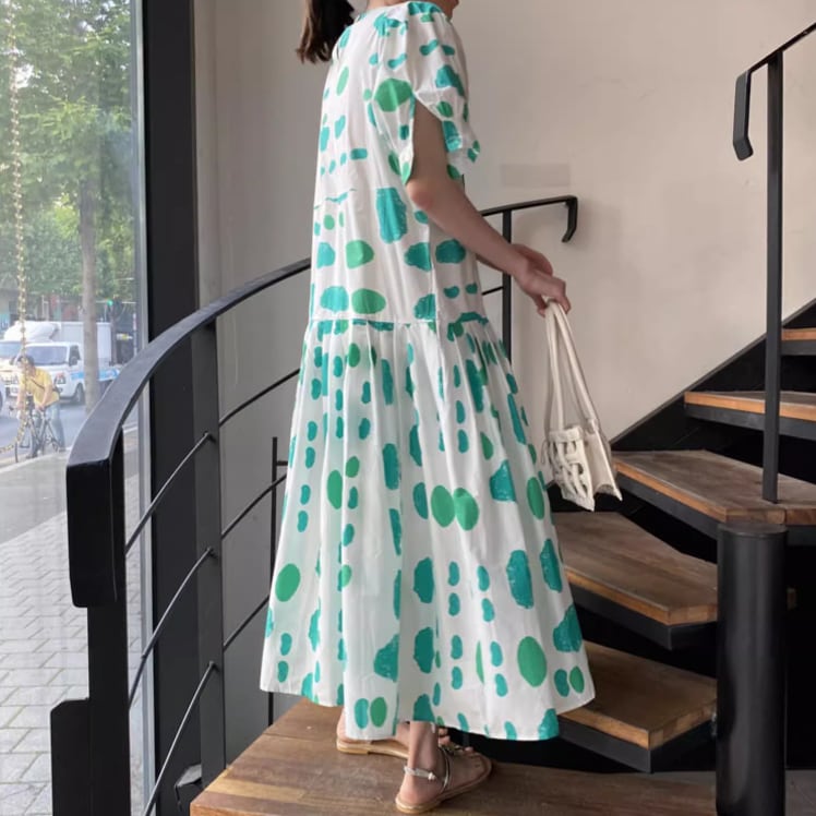 ウォーターペイントドット パフスリーブワンピース グリーン OP00129