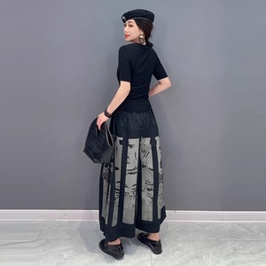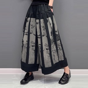 モノトーンのグラフィックプリントがスタイリッシュなワイドレッグパンツです。ヒップからのプリーツタックで下半身がすっきりと見えます。スニーカーでカジュアルに着こなしても、ヒールパンプスでエレガントにも、幅広いスタイルに対応します。1年を通してイージーに使えて、ハイセンスな着こなしが楽しめます。シワにならず、気軽にスタイリングができますので、旅行やプール、海などにもオススメです。
