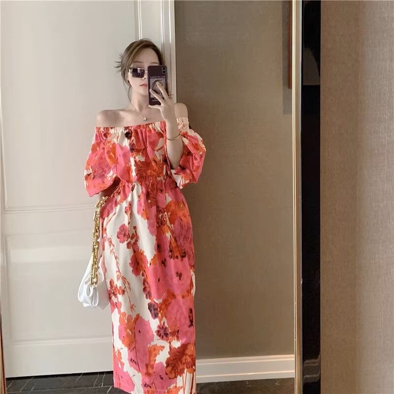 水彩画のような美しいフラワーペインティングプリントとオフショルダー、ランタンスリーブがポイントのロング丈のワンピースです。エレガントで品のあるプリント柄と、メリハリのあるシルエットで、このワンピース1枚で印象的なコーディネートが完成します。フラットサンダルと合わせるだけで様になる、春夏におすすめの印象的なワンピースです。夏の楽しいイベント、バカンスや海などにもおすすめです!