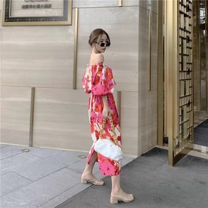 フラワーペインティングプリント オフショルダーロングワンピース マゼンタ OP00271