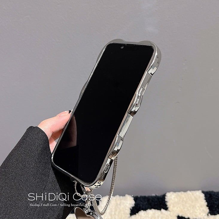 オールシルバーと大きめのトリプルハートがスタイリッシュなiPhoneケースです。 シルバーのチェーンストラップにはハート型のカバー付きミラーチャームが付属、簡単なメイク直しなどもできる便利なケースです。丈夫なケースが大切なiPhoneを傷や破損から守ります。オールシルバーでコーデのアクセントになり、ストラップ付きで携帯も楽々、便利なミラーも付属、オールマイティーなiPhoneケースです☆