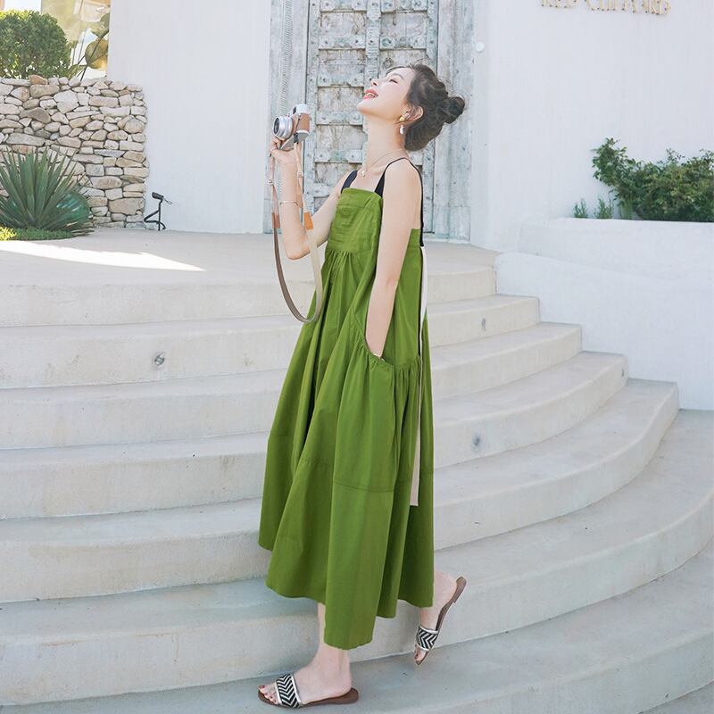 バイカラーリボンストラップ ロングワンピース アボカドグリーン OP00236