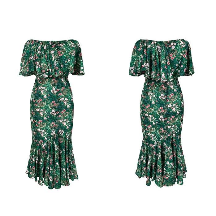 フローラルプリント オフショルダー マーメイドシルエットワンピース グリーン OP00284