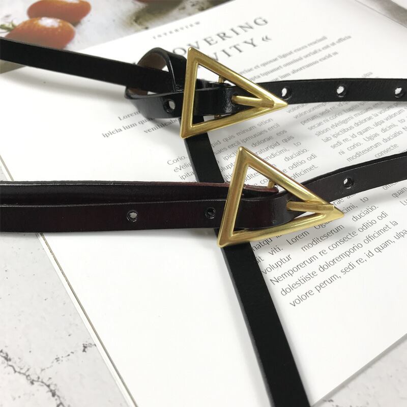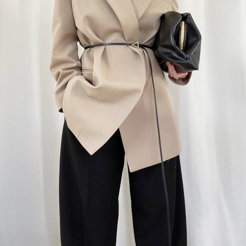 ゴールドのトライアングルバックルがポイントのエコレザーのロングベルトです。超ロング+細めのベルトですので、画像のようにベルトに巻き込んだり、そのまま垂らしたり、ユニークなベルトアレンジが楽しめます。ジャケット、シャツ、ワンピースなどのウエストマークにおすすめです。