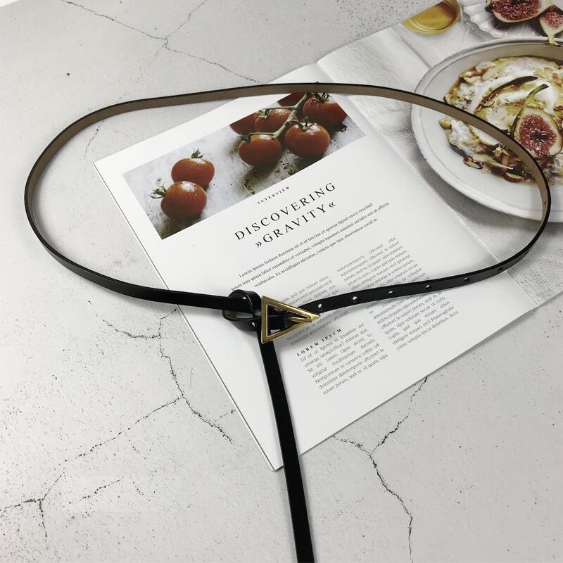 ゴールドのトライアングルバックルがポイントのエコレザーのロングベルトです。超ロング+細めのベルトですので、画像のようにベルトに巻き込んだり、そのまま垂らしたり、ユニークなベルトアレンジが楽しめます。ジャケット、シャツ、ワンピースなどのウエストマークにおすすめです。