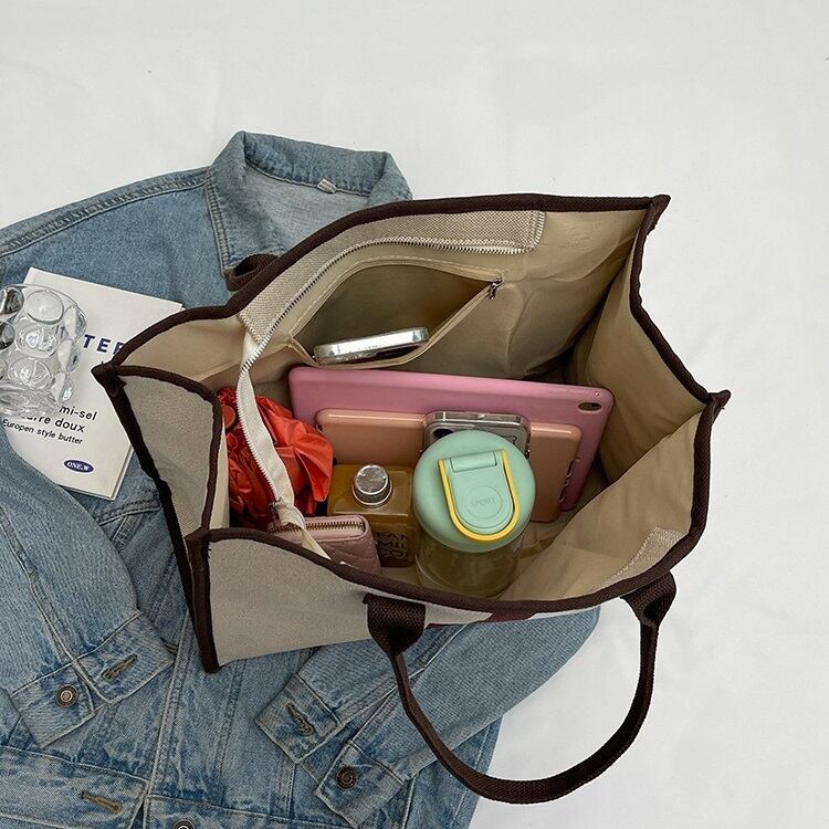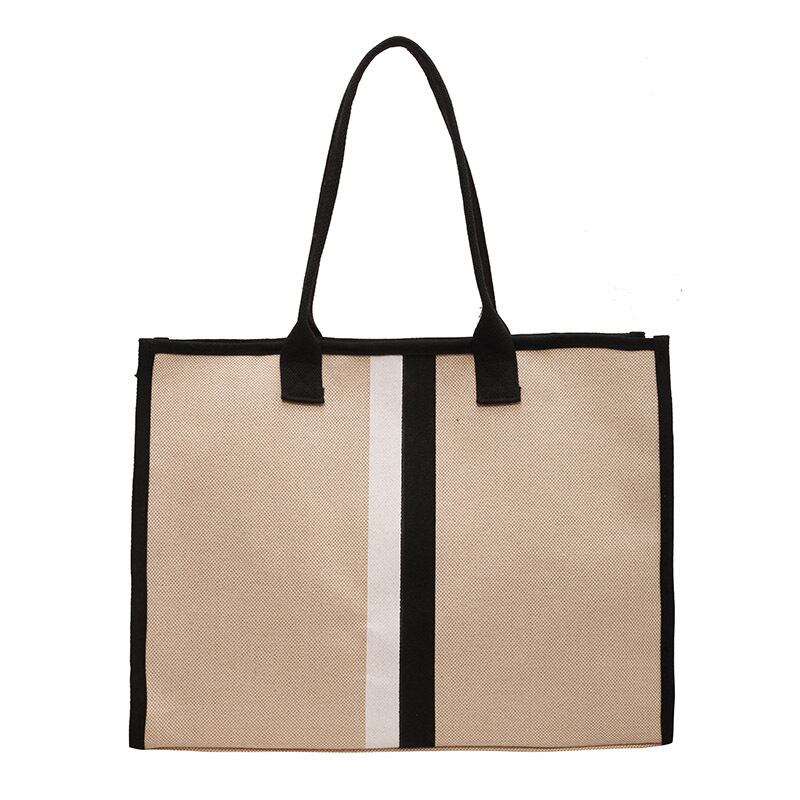 ダブルストライプがポイントのスタイリッシュなデザインのトートバッグです。しっかりとしたコットンキャンバスを使用しており、A4サイズの書類も楽々入ります。荷物の多い方にもおすすめの大きめサイズです。スマートなデザインで、通勤バッグにもおすすめです。
