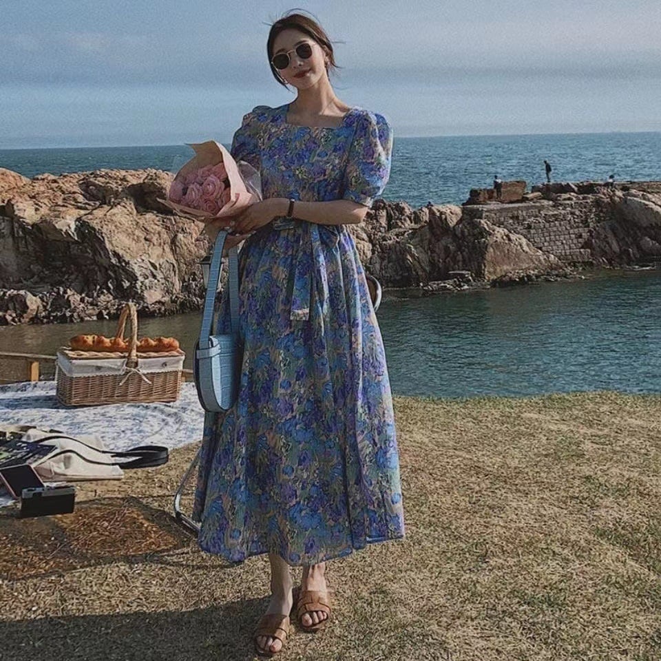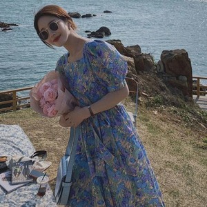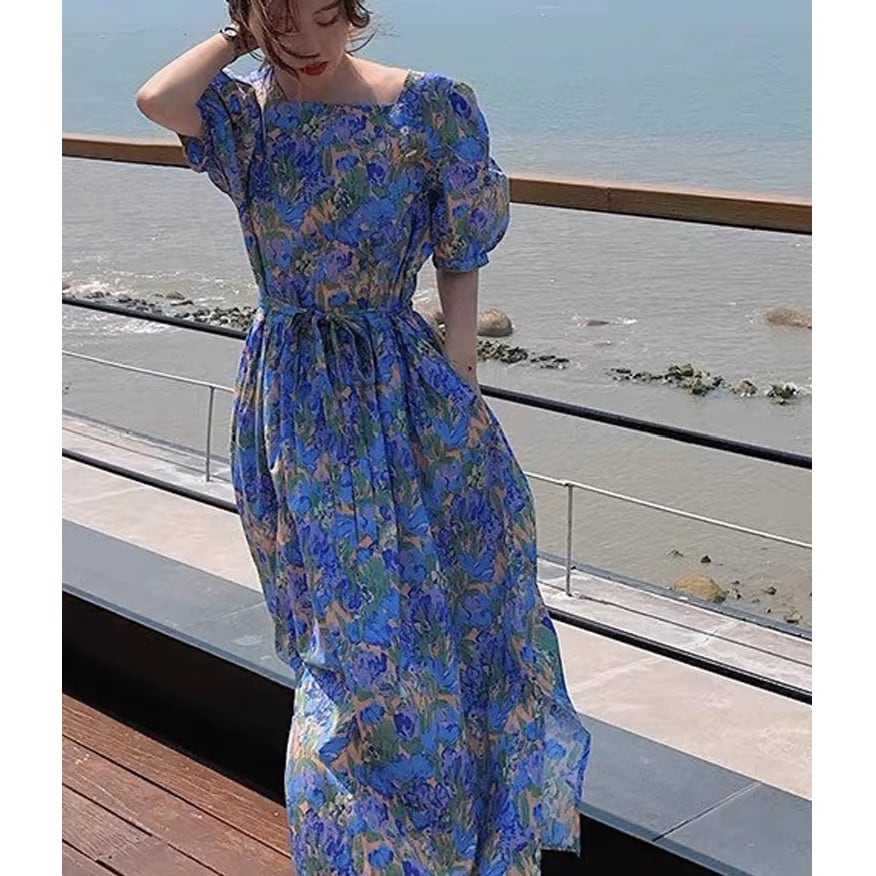 アンティークフラワープリント パフスリーブロングワンピース ペールブルー OP00316