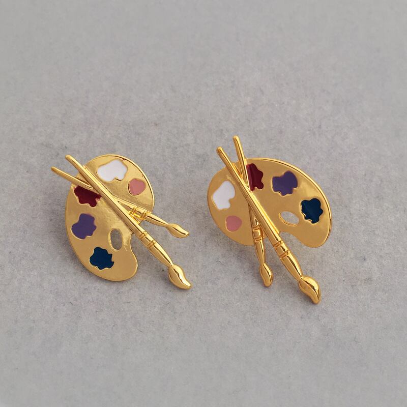 パレット&ブラシをモチーフにしたユニークなスタッズピアスです。カジュアルなスタイルのワンポイントに、マニッシュやモードスタイルの外しのアクセントとして、幅広いコーディネートにおすすめの個性派ピアスです。絵を描くのが好きなお友達へのプレゼントにもおすすめです!