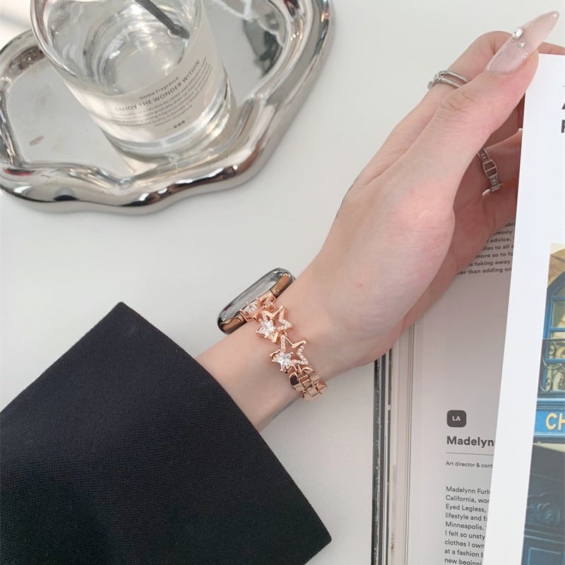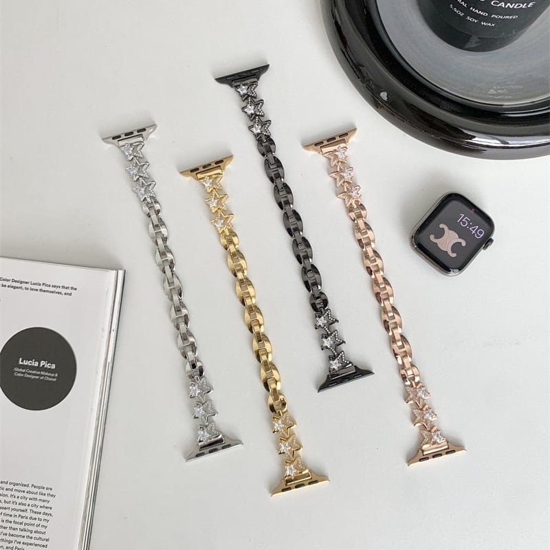 ジルコニアの入った星型のフレームがフェミニンなApple Watchバンドです。スマートウォッチを上品にスタイリングできます。ブレスレット感覚でベルトも着け替えたくなる、オシャレなデザインです。それぞれ雰囲気のことなる4色展開です!