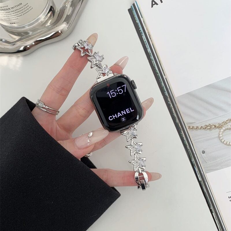 ジルコニアの入った星型のフレームがフェミニンなApple Watchバンドです。スマートウォッチを上品にスタイリングできます。ブレスレット感覚でベルトも着け替えたくなる、オシャレなデザインです。それぞれ雰囲気のことなる4色展開です!
