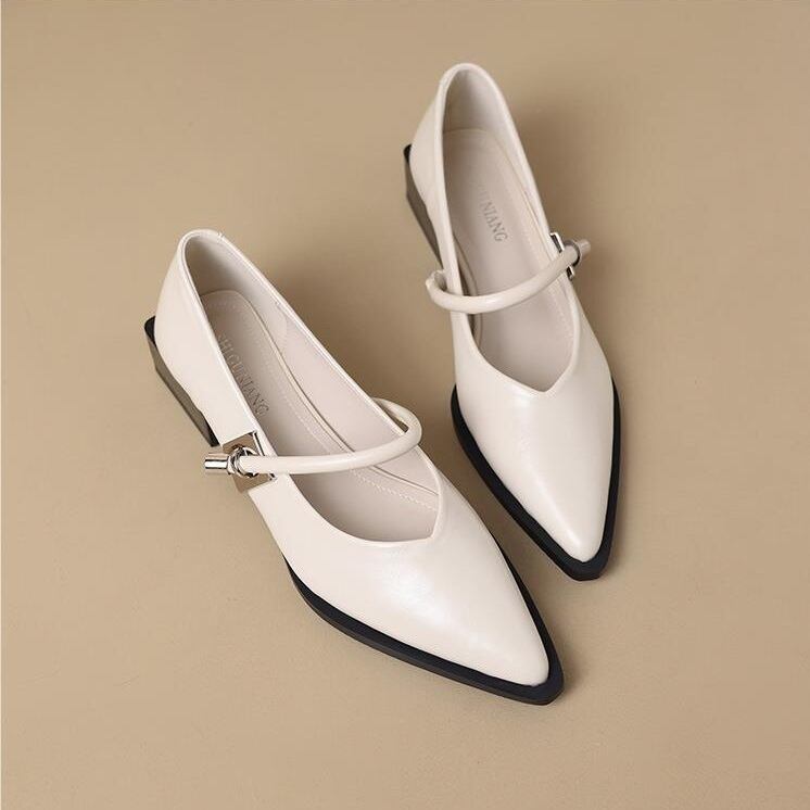 チューブのストラップとシルバーの留め具がスタイリッシュなメリージェーンパンプスです。ポインテッドトゥとストラップのデザイン、ブロックヒールフォルムなど、細部までエレガントなデザインです。
