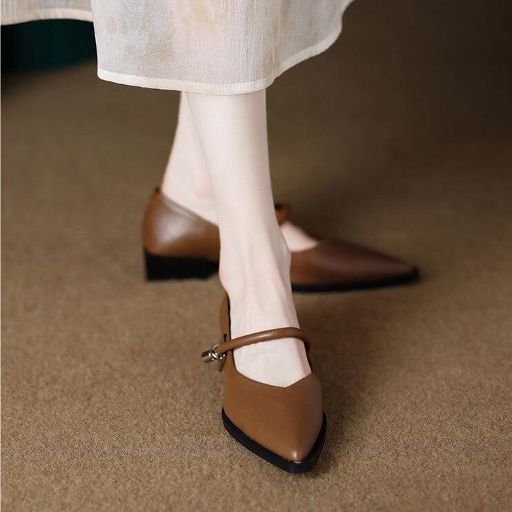チューブのストラップとシルバーの留め具がスタイリッシュなメリージェーンパンプスです。ポインテッドトゥとストラップのデザイン、ブロックヒールフォルムなど、細部までエレガントなデザインです。