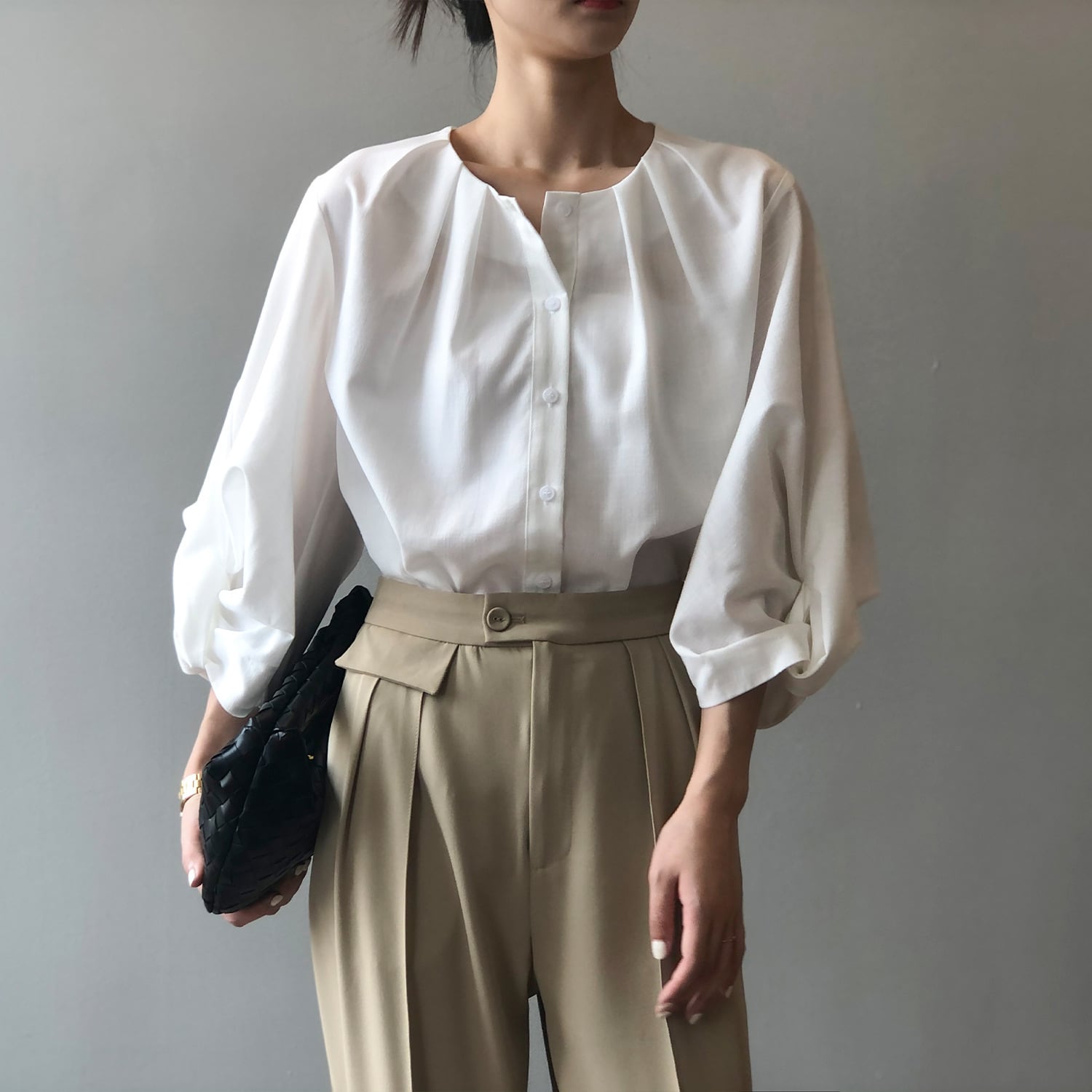 衿と袖に入ったタックが生み出すプリーツがポイントのノーカラーブラウスです。衿まわりと袖にタックが入っており、女性らしいやわらかさと美しいシルエットを作ります。ボトムスにインしても、外に出してもバランスの取りやすいシルエットと着丈で、スカート、パンツ、ワンピースなど幅広いアイテムと合わせやすいデザインです。お仕事用、プライベートどちらもスタイリング可能です!