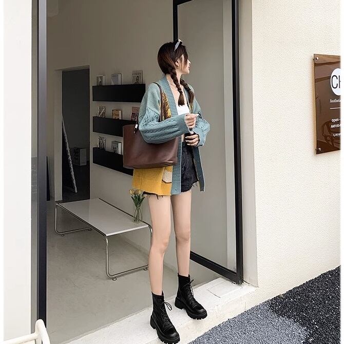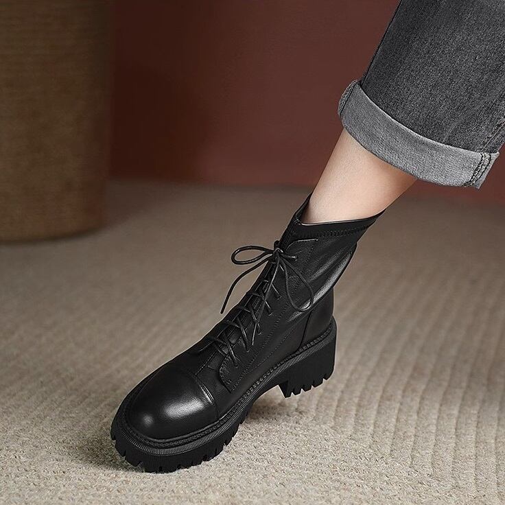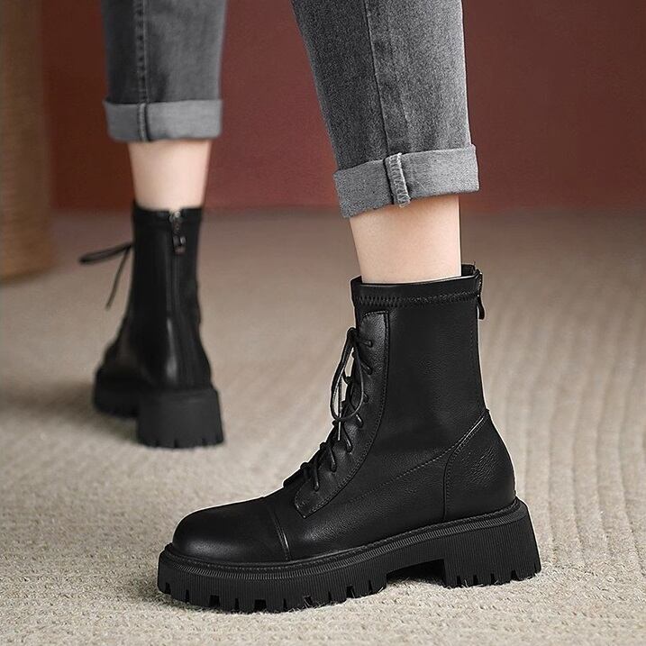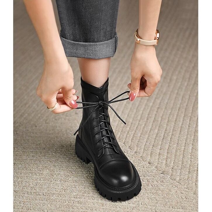 リアルレザーの6ホールのレースアップブーツです。どんなスタイルにも合わせやすく、秋冬だけでなく1年を通して幅広いコーディネートにマッチするハイセンスなデザインです。5cmのブロックヒールとスリップ防止のアウトソールで歩きやすさも◎です。着脱が楽なバックファスナーも魅力です。21.5cm~25.0cmまでサイズございます、リアルレザーの割にお求めやすい価格も◎です!