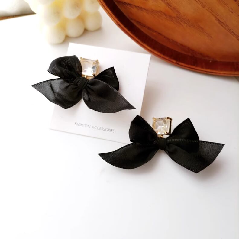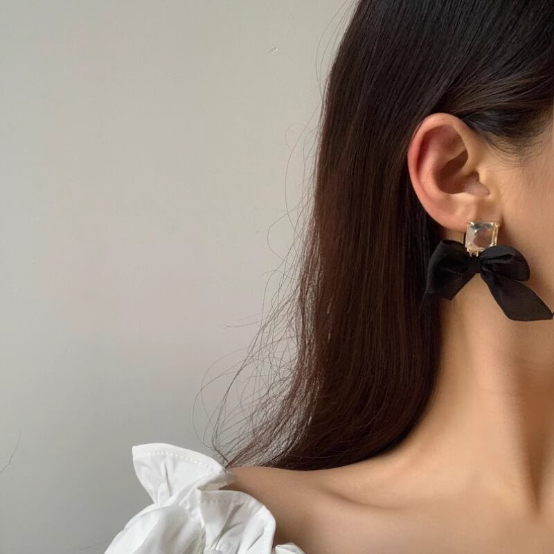 ブラックシフォンのリボンとクリアなスクエアチャームをミックスしたドロップピアスです。シンプルなブラウス、ニットなどとスタイリングするだけで、印象的なコーデが完成します。シフォン素材ですので、サイズやシルエットをスタイルに合わせてアレンジできます。