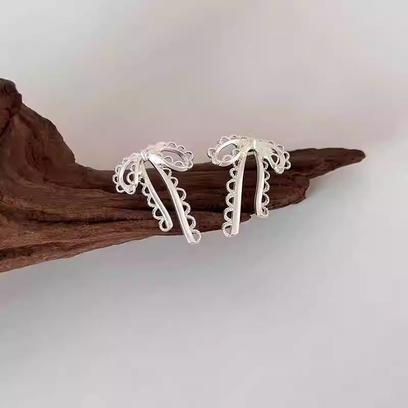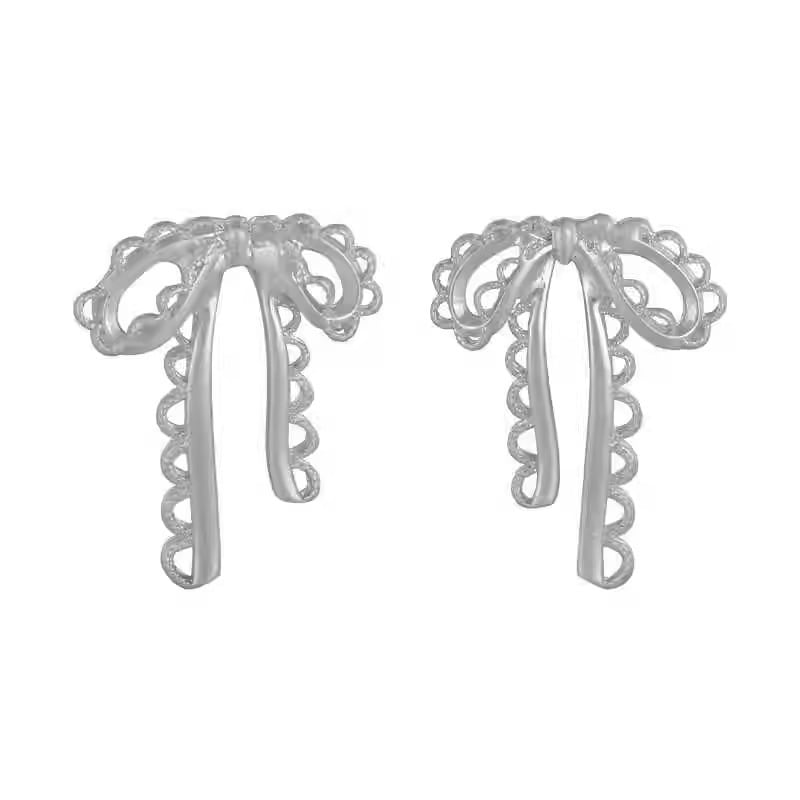 レースのリボンをモチーフにしたフェミニンなスタッズピアスです。ロマンティックでフェミニンなデザインとマットプラチナのソフトさで、カジュアルなデニムスタイルから、ドレッシーなスタイルまで、女性らしい華やかな雰囲気に仕上がります。