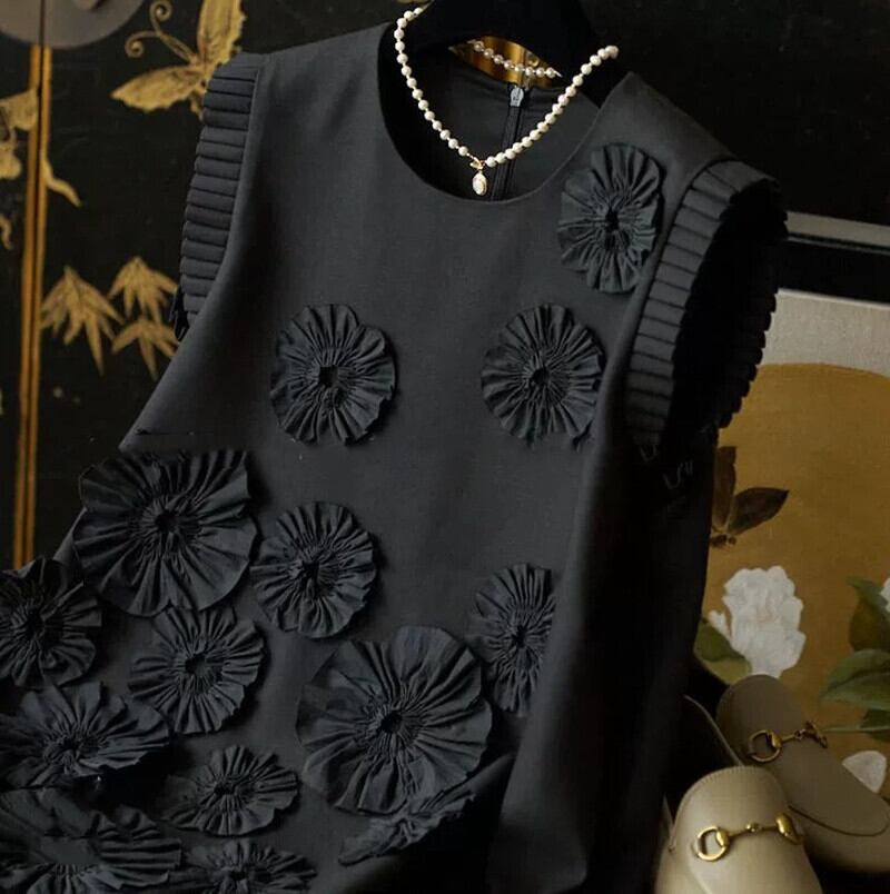 フリルのお花がデコレーションされたフェミニンなミニ丈のノースリーブワンピースです。袖のフリルやクラシックなシルエットなど、細部までこだわりのデザインです。1枚でさらっと着るだけで華やかで女性らしいスタイリングが完成します。夏は1枚で、春夏はブラウスやカットソーをインナーにして、秋冬はジャケットやカーディガンなどと合わせて、1年を通して幅広いスタイルが楽しめます。しっかりとした布地と質の良い仕立ても魅力です。