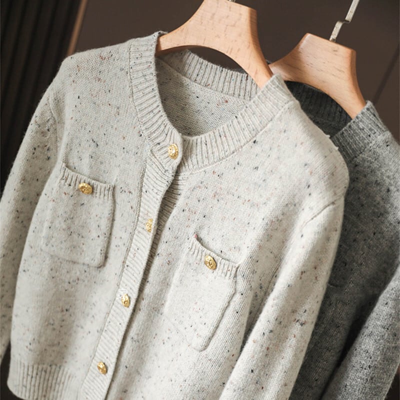マットゴールドのボタンづかいがポイントのウール100%のクルーネックカーディガンです。ミックスカラーのウールと袖口、胸ポケットを飾るラグジュアリーなボタンなど、細部までエレガントなデザインです。使いやすいショート丈でパンツ、スカートなどどんなアイテムとも相性の良いデザインです。1年を通して幅広いスタイリングが楽しめます。品のあるデザインで、通勤用にもおすすめです。