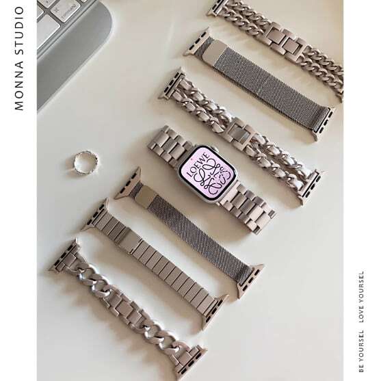 オイスタータイプのワイドベルトがポイントのApple Watchバンドです。エレガントなマットなホワイトゴールドとスタイリッシュなデザインで、スマートウォッチを上品にスタイリングできます。ブレスレット感覚でベルトも着け替えたくなる、オシャレなデザインです。