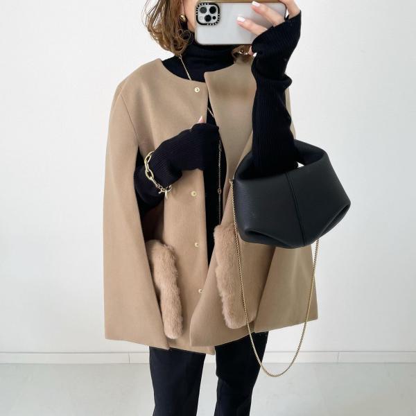 高級感のあるキャメルベージュにエコファーのポケットをプラス、ユニークなケープ・ノースリーブジャケットです。ノーカラー、衿まわりや袖のデザイン、美しいシルエットなど、女性らしさが際立つフェミニンなデザインです。ボトムスを選ばず、カーディガン感覚で幅広いスタイリングが可能です。スカート、パンツ、ワンピースやサロペット、どんなアイテムと合わせても、ハイセンスなスタイリングが楽しめます。