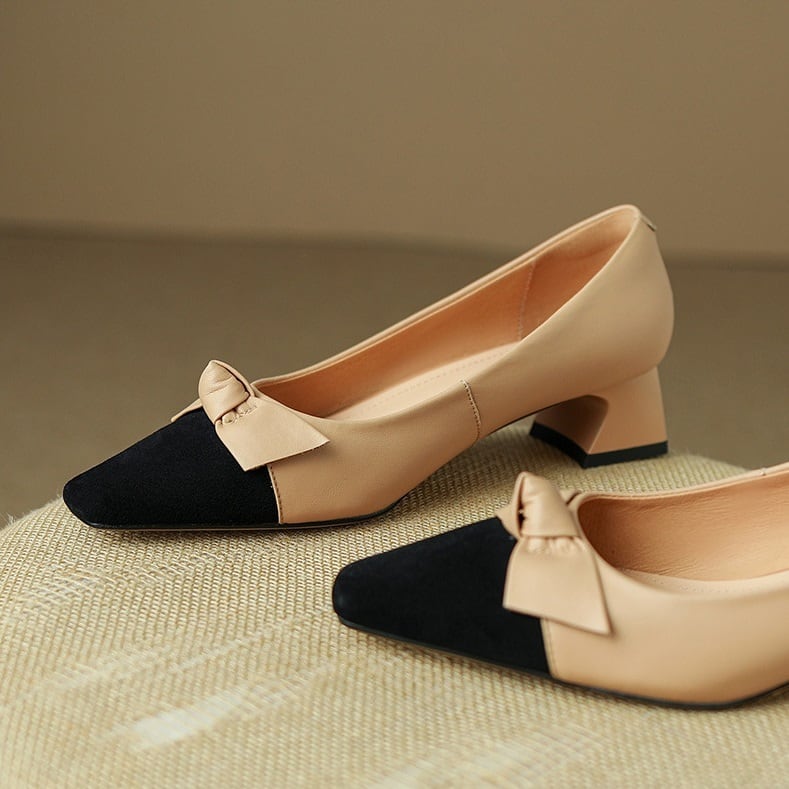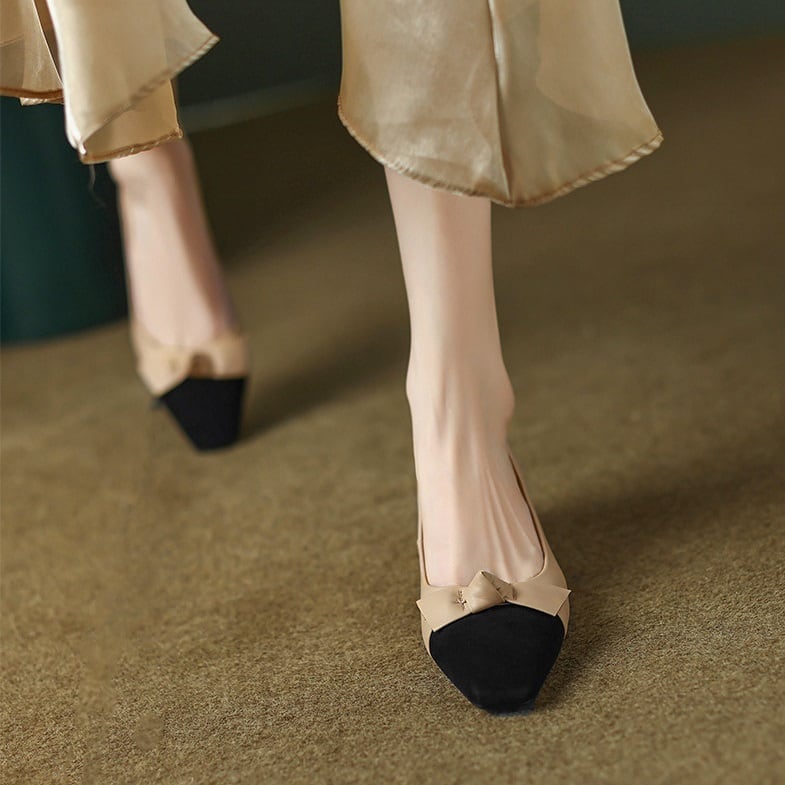 スウェードとレザーのコンビネーションがポイントのリボン付きヒールパンプスです。リボンのついた部分はレザー、トゥはスウェードになっており、異素材のコンビネーションが楽しめるスタイリッシュなデザインです。ソフトなレザーを使用しており脚にやさしくフィットし、安定感のある低めのヒールと滑りにくいソールで歩きやすさも◎です。通勤にもプライベートにもお使いいただけるエレガントなデザインです。