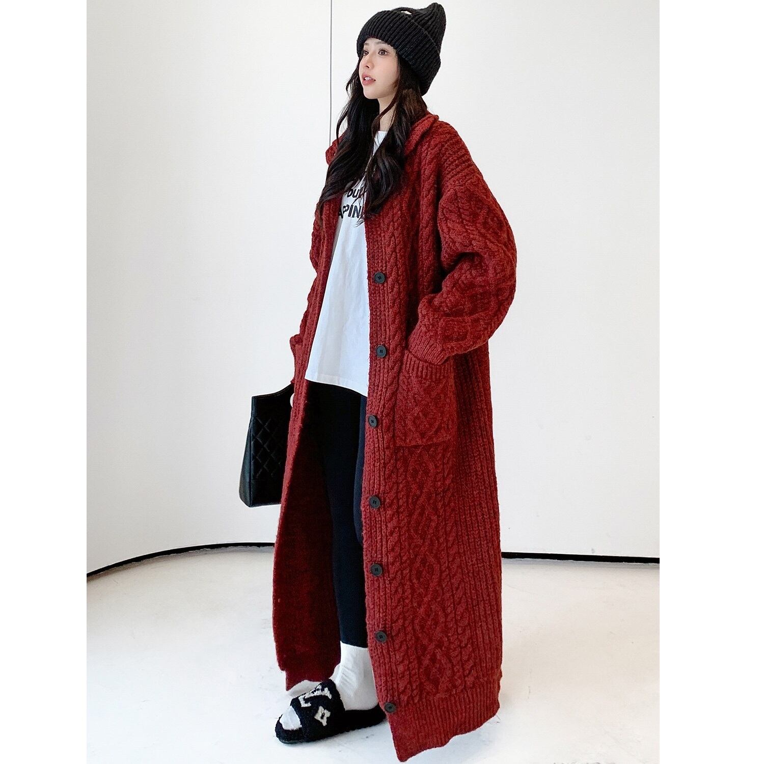 ケーブルニット ロングカーディガン・ニットコート バーガンディー NI00313