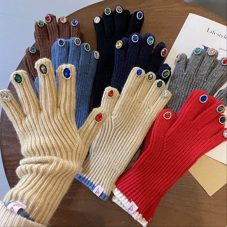 指先にビジューをデコレーションしたウール混の手袋です。指先のビジューがネイルアートのようにキラキラと輝く、ユニークなデザインです。幅広いアウターに合わせやすいカラーリングです。寒い日でもほっこり心から温かくなる、おすすめの手袋です。