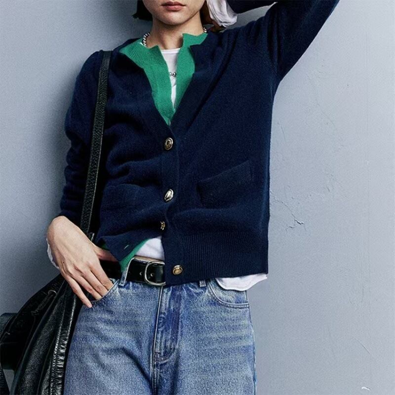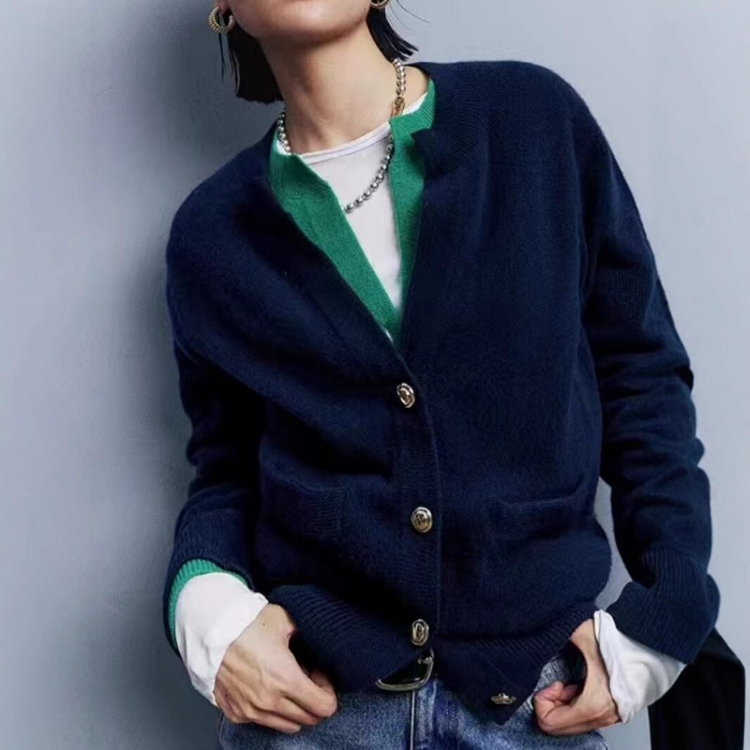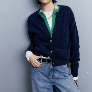 ウール100%のラウンドネックのニットカーディガンです。ラウンドネックの一番上のボタンがなくVネックになっていたり、シルバーのボタンやポケットなど、細部までこだわりのデザインです。使いやすいショート丈でパンツやスカート、ワンピースなどともスタイリングが楽しめます。エレガントにもポップにも、お仕事にもプライベートにも、幅広くお使いいただけるデザインです。上質なウール100%で保温性も高く、寒がりさんにもおすすめのカーディガンです。