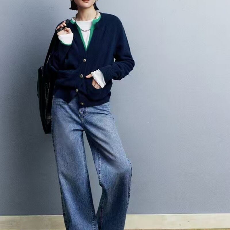 ウール100% ハイネック リブニットカーディガン ネイビー NI00331