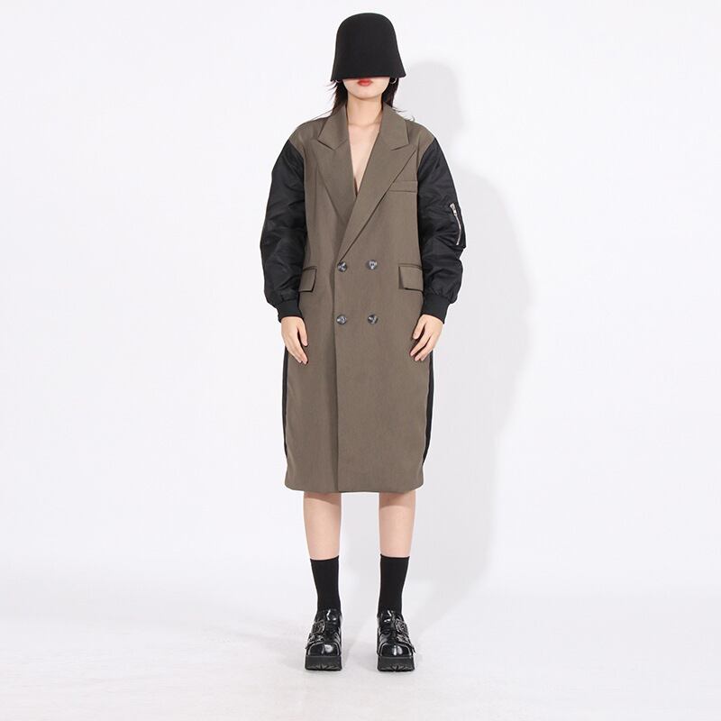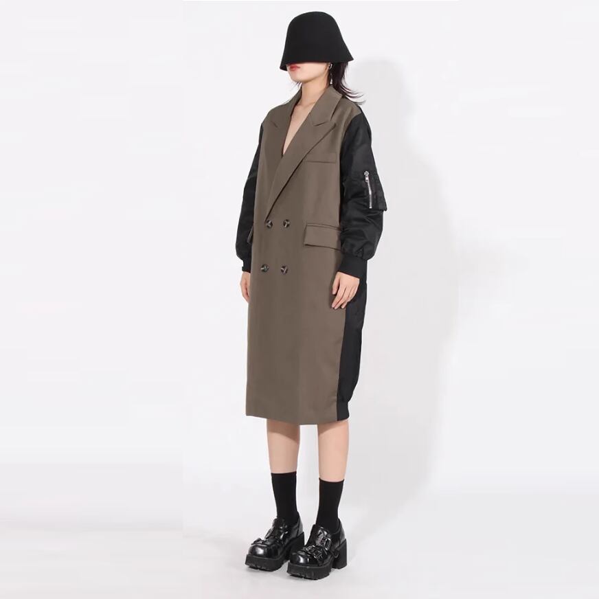 ナイロンジャケット+トレンチコートをミックスしたロング丈のコートです。前身頃はダブルのトレンチコート、袖と後ろ身頃はナイロンジャケット、ユニークなコンビネーションが楽しめるデザインです。合わせるアイテムによって、エレガントにもストリート寄りのカジュアルにも、どちらにもスタイリングが楽しめます。インポートならではのユニークなデザインです!