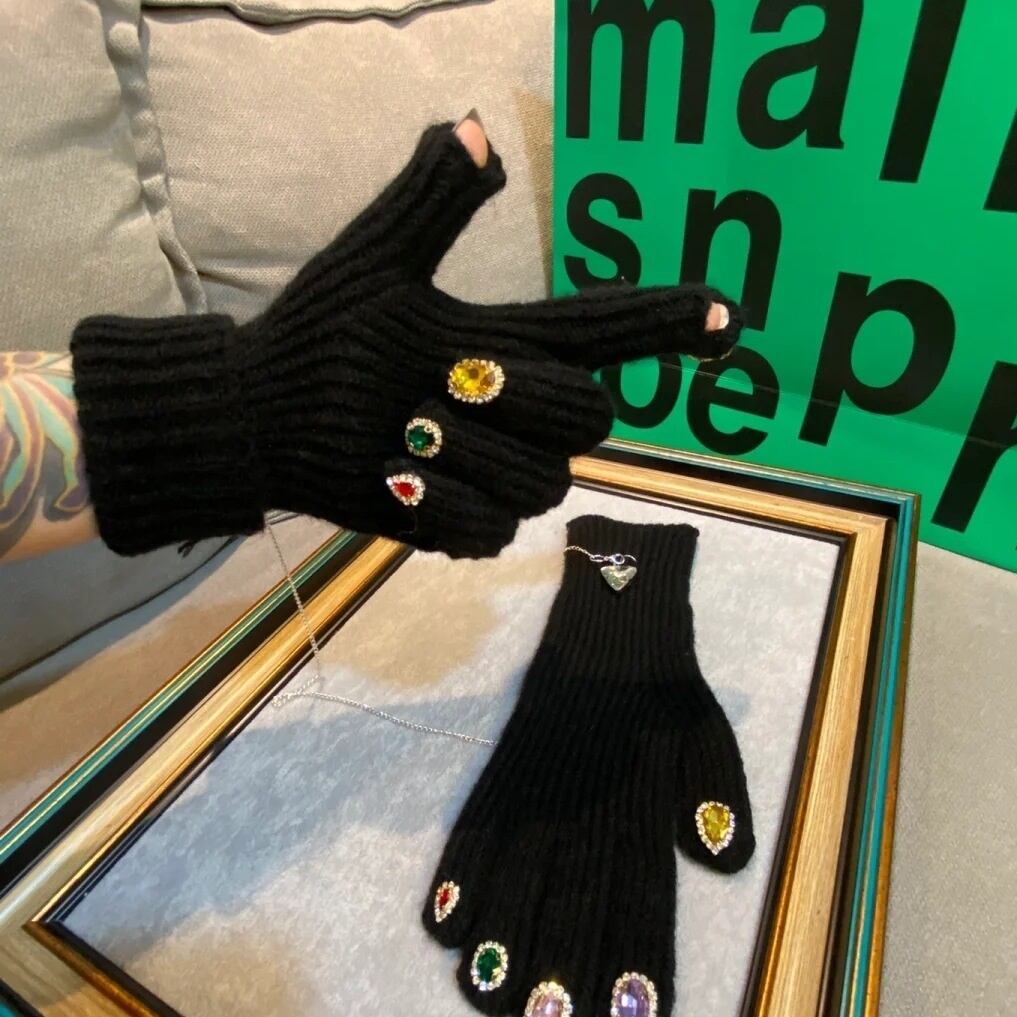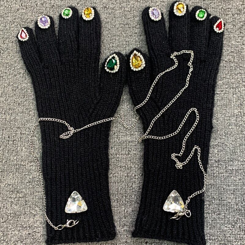 マルチビジューデコレーション ニットグローブ・手袋(グローブホルダーチェーン付)ブラック FK00089