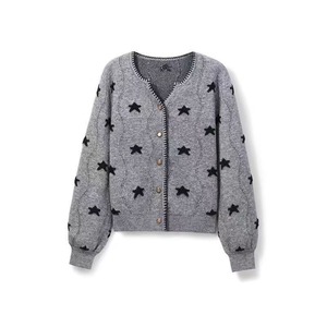 グレーにブラックのスター柄をアレンジしたニットカーディガンです。身頃に入ったウェーブのニッティングデザインや衿、ボタンまわりのステッチなど、細部までこだわりのデザインです。エレガントにも、カジュアルにも、いつものコーディネートがフレッシュに生まれ変わる、遊び心あふれるアイテムです。