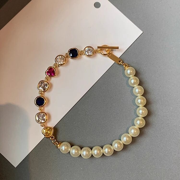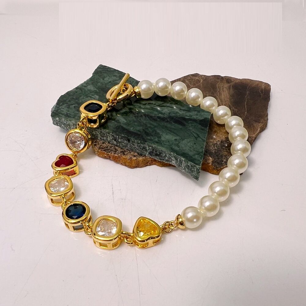 ジルコニアストーンチャーム+ガラスパール ハーフコンビブレスレット ゴールド BC00018