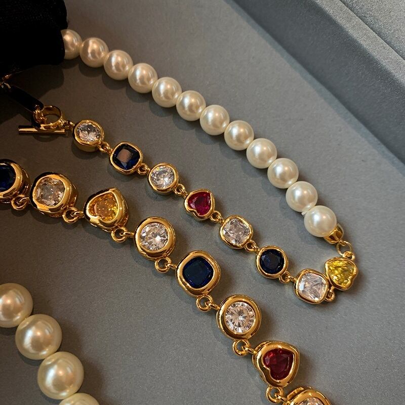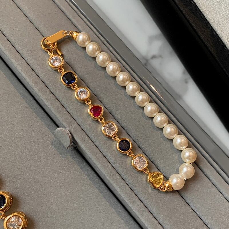 ガラスパールとマルチカラービジューをミックスしたエレガントなブレスレットです。パールネックレスのエレガントさはそのままに、マルチカラーのビジューのフェミニンさをミックスしたスタイリッシュなデザインです。Tシャツなどカジュアルなスタイルから、エレガント、マニッシュなスタイルまで、幅広いコーディネートのアクセントにおすすめです。