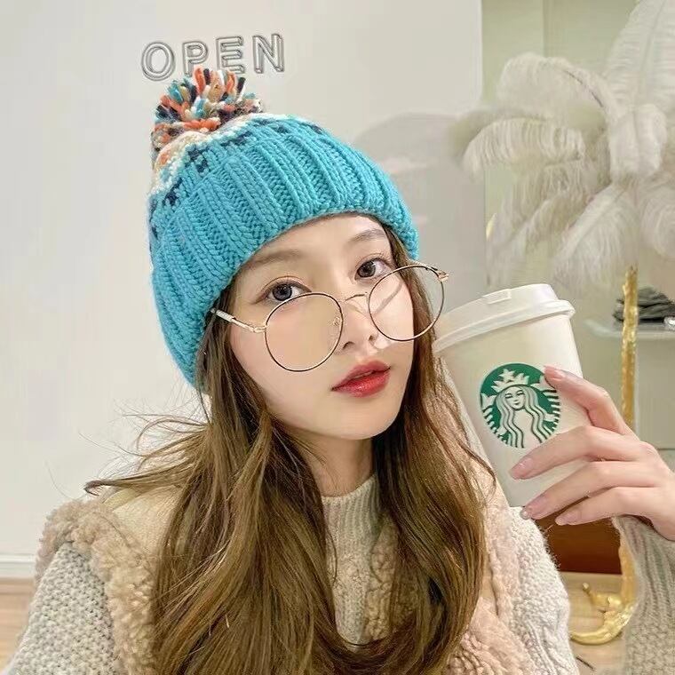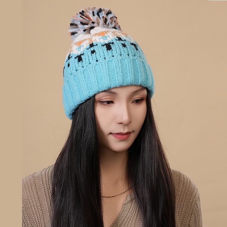 ポンポン付き モザイクアレンジ ウールニットキャップ ロイヤルブルー BO00116