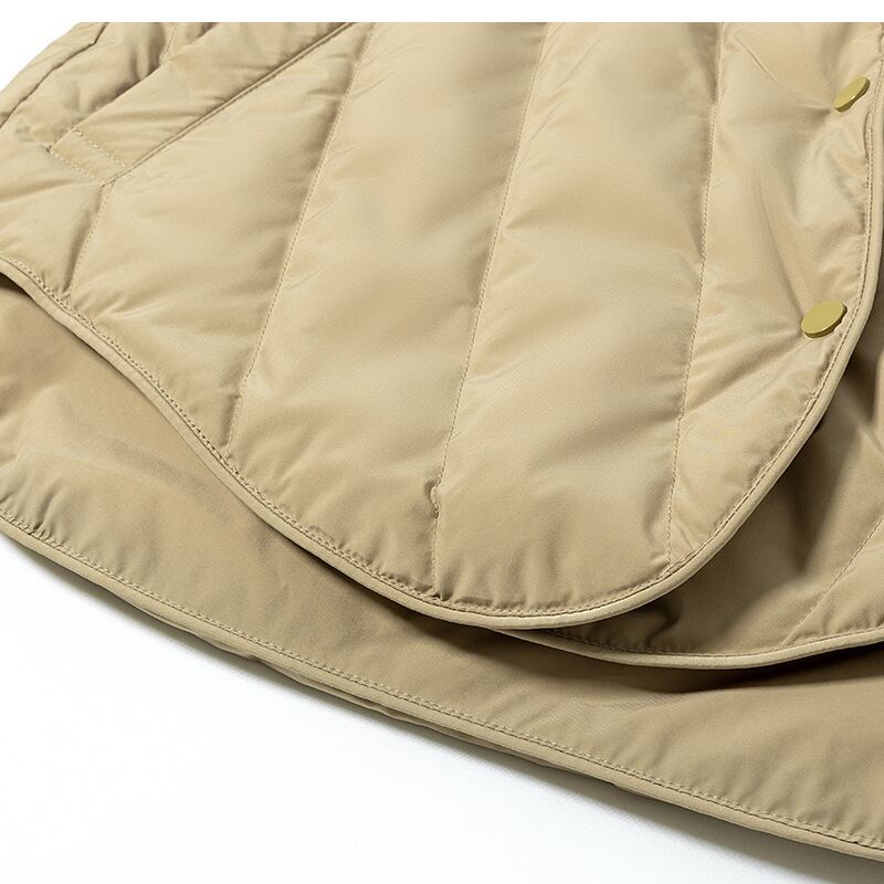 デザイン性の高い、エレガントなノーカラーのダウンジャケットです。ノーカラーや裾のカッティング、ウエストベルトでアレンジできるシルエットなど、大人の女性におすすめのエレガントなデザインで、カジュアルになりがちなダウンジャケットコーデがすっきりとハイセンスに決まります。ハイネックやタートルネック、ストールやマフラー、ネックレスやペンダントなど、首や衿まわりのおしゃれをスマートにアピールできるデザインです。