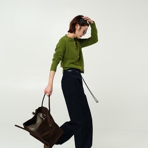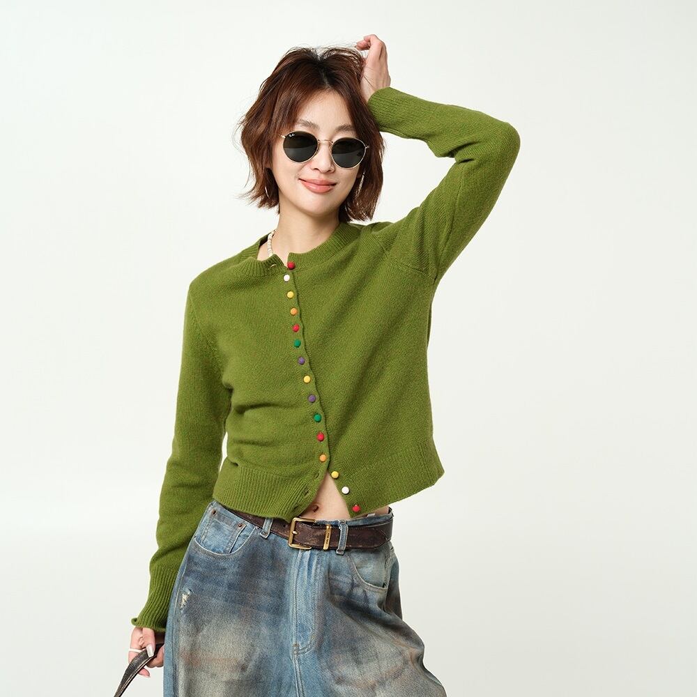 ウール100%のクルーネックのニットカーディガンです。アボカドグリーンとマルチカラーの小さめボタンがポイントです。使いやすいショート丈でパンツやスカート、ワンピースなどともスタイリングが楽しめます。エレガントにもポップにも、お仕事にもプライベートにも、幅広くお使いいただけるデザインです。上質なウール100%で保温性も高く、寒がりさんにもおすすめのカーディガンです。