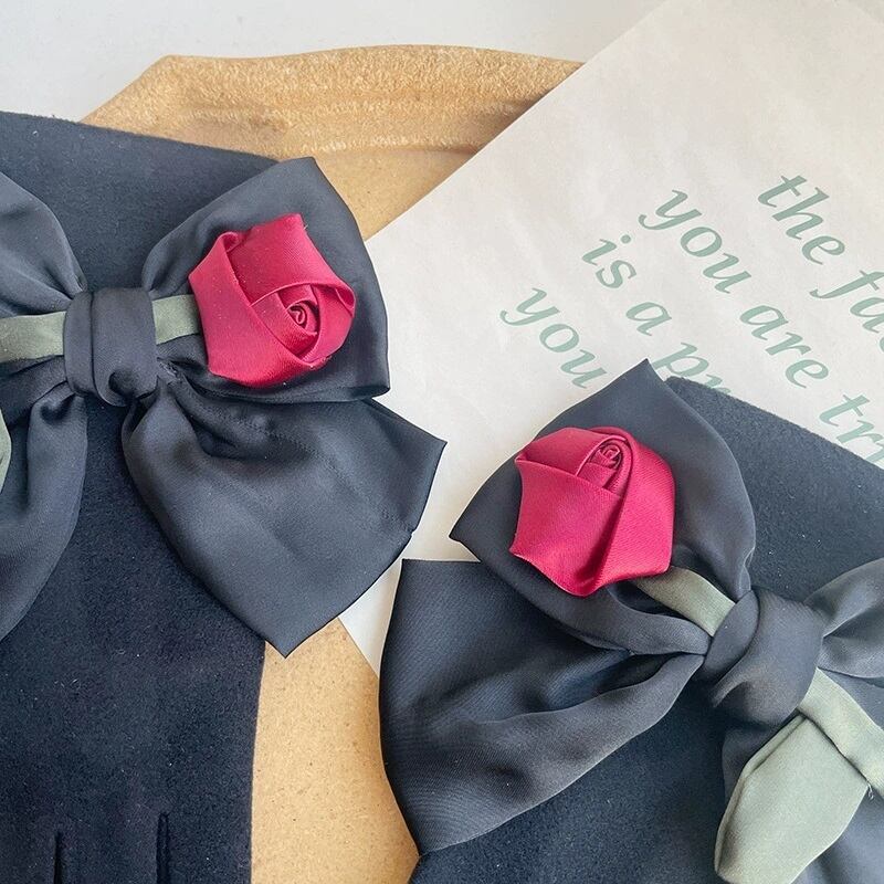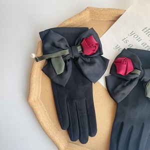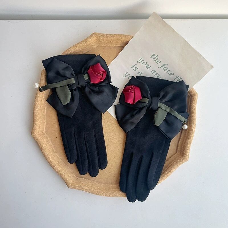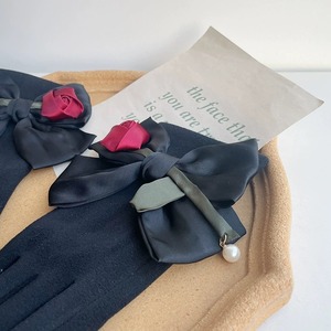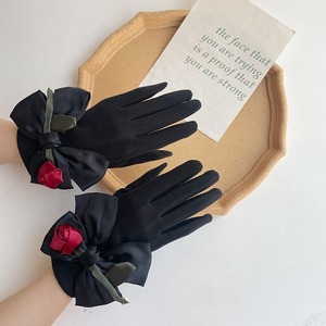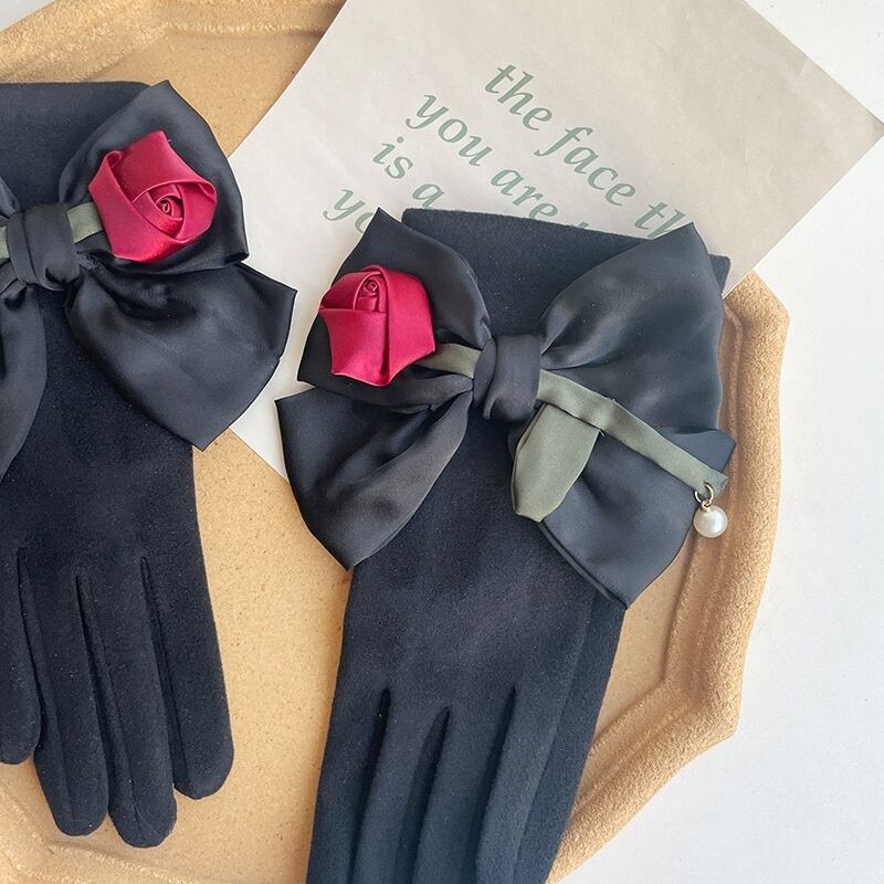 サテンローズ+リボン ウールミックスグローブ・手袋(スマホ操作OK)ブラック FK00102