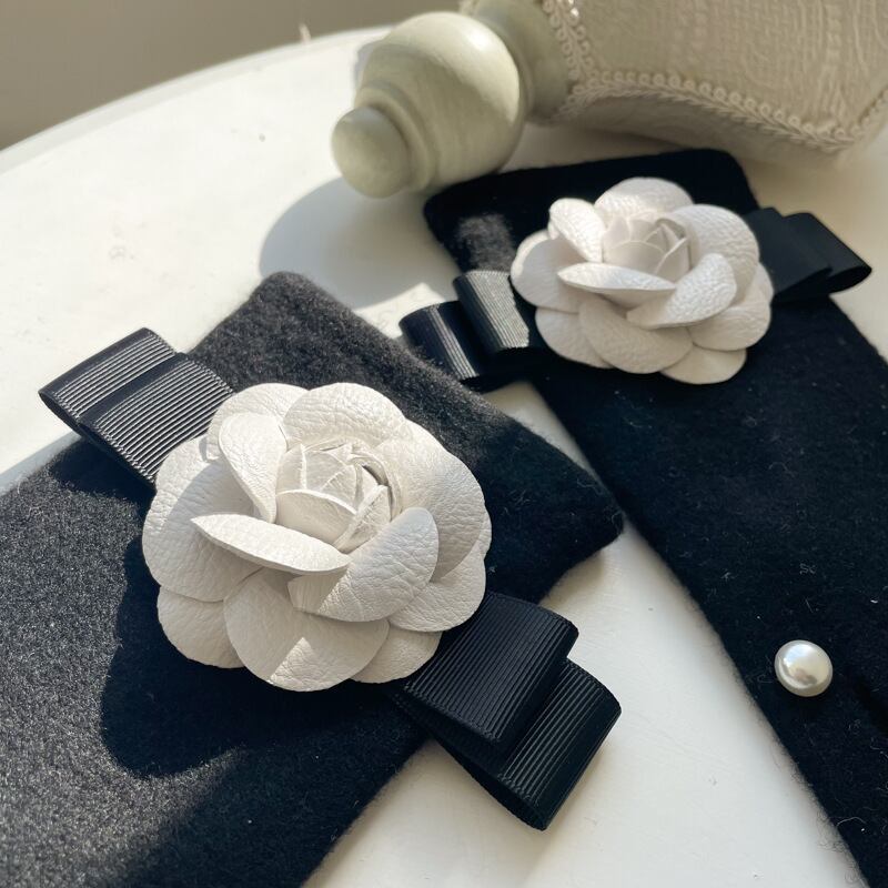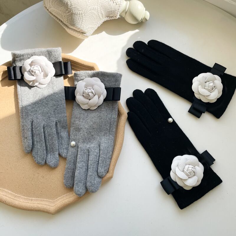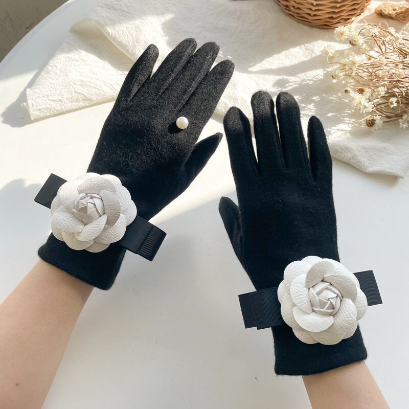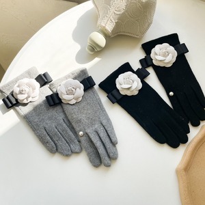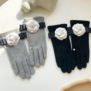 ホワイトのカメリアチャームとブラックリボン、指先の一粒パールがポイントのエレガントななウール混の手袋です。秋冬のコーデのアクセントにおすすめです。スマホ対応や裏起毛など機能面も◎、寒い日でも指先からおしゃれに気分良く過ごせます、ハンドケアにもおすすめの手袋です♪