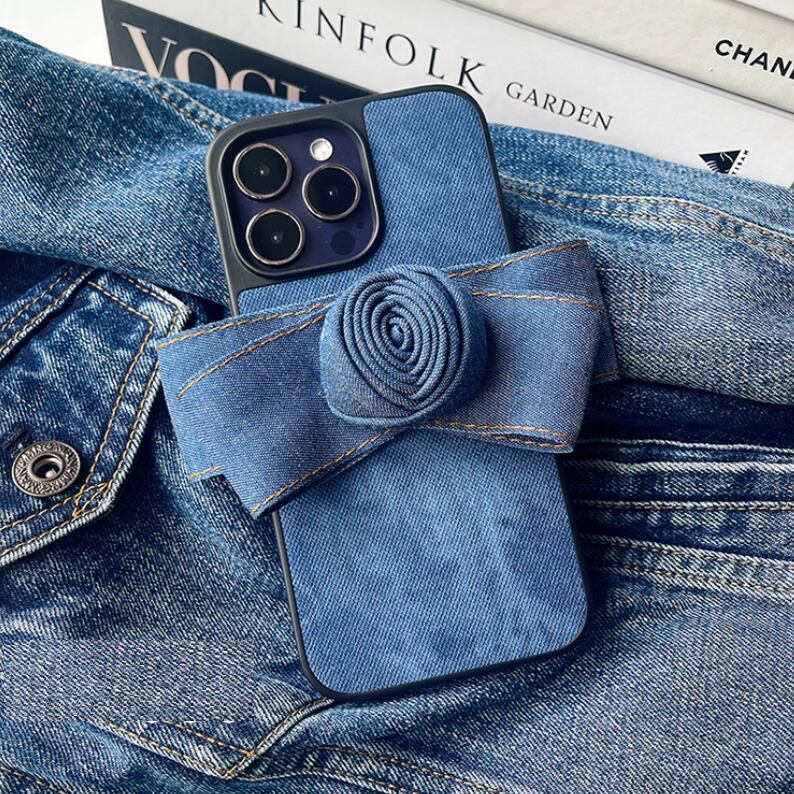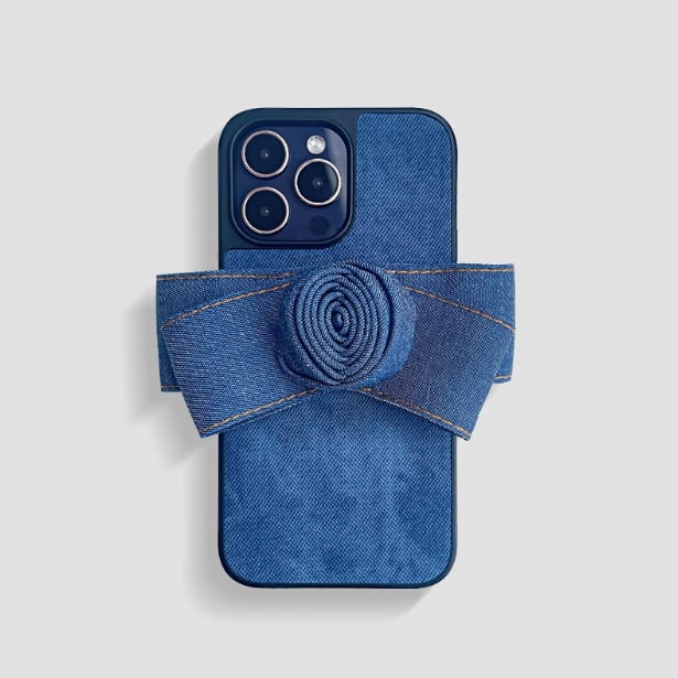 バラのようなお花のチャームとボウタイリボンをアレンジしたデニムコーティングのiPhoneケースです。デニム地に本格的なシングルステッチが入ったスタイリッシュなデザインです。デニムのように、1年を通してどんなスタイルにもフィットします◎ ソフトシリコン+デニムコーティングの丈夫なケースが大切なiPhoneを傷や破損から守ります。SNS映えもパーフェクトなiPhoneケースです。