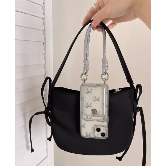 カードスロット+ストラップ付きで使いやすい、クリア素材のハードシェルのiPhoneケースです。クリア素材にラベンダーカラーのリボンモチーフがプリントされており、ボディーのフレームとハンドストラップにはシルバーを使用したフェミニンなデザインです。